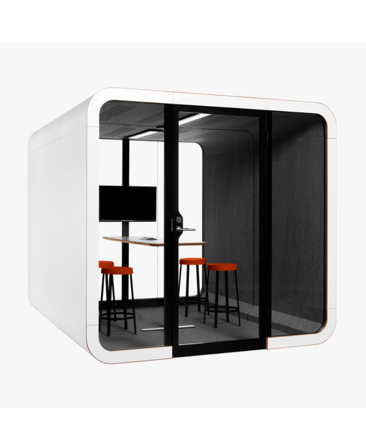 Bu akustik toplantı kabini, 6 kişiye kadar kapasiteli açık ofisler gibi gürültülü çalışma ortamları için yenilikçi bir çözümdür. Özelleştirilebilir oturma yerleri ve masalar, LED ışıklar ve güç prizleri ile yüksek düzeyde konfor sağlar.