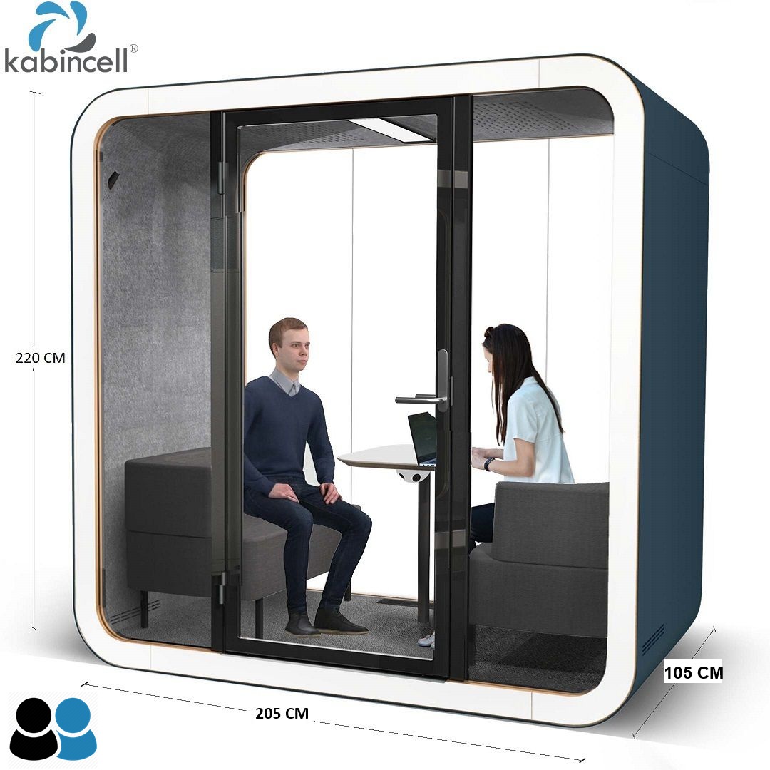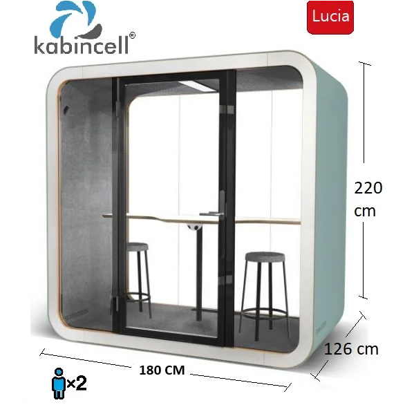 Kabincell® Lucia L pod ofis toplantı kabini ; 2 kişilik kabin, tam gizlilik için mükemmel çözümdür. Bölmenin içinde gürültüyü korumak için en yüksek kalitede akustik ses panelleri kullanılmıştır.