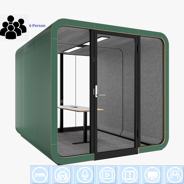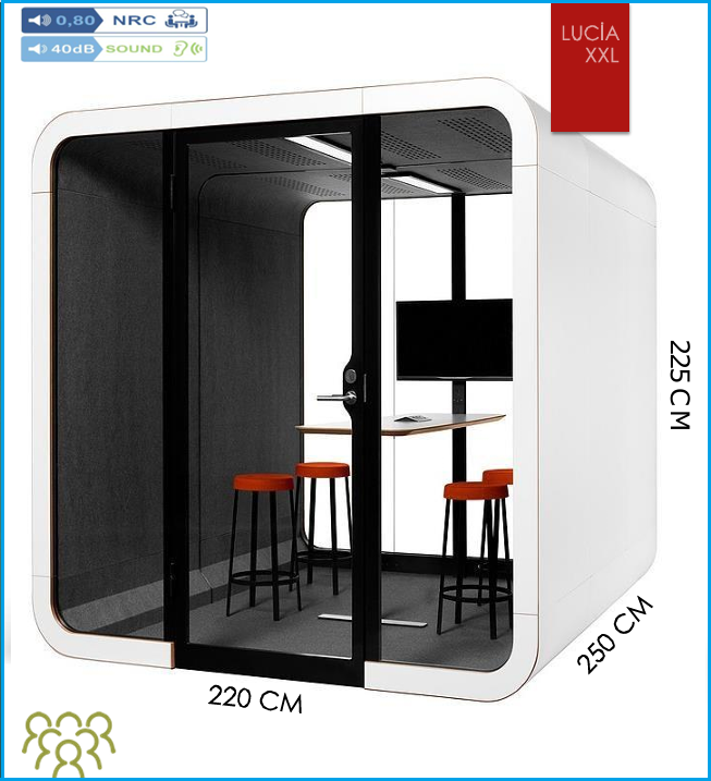 Kabincell Lucia XXL Toplantı Kapsülü bilgi paylaşımı ve karar alma toplantıları için mükemmeldir. Tüm ses geçirmez oda gereksinimlerini karşılar.